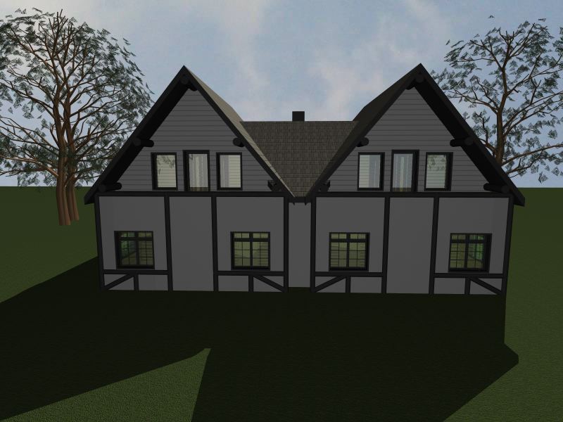 Ontwerpstudie voor het bouwen van retro vakwerkhuis twee-onder-een-kapwoning voor een stuk grond in Altastenberg in Duitsland